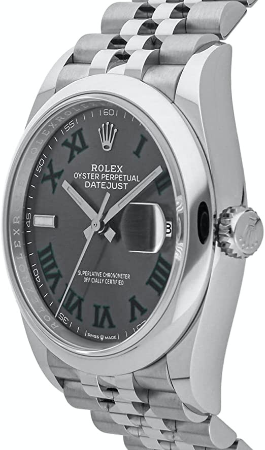 Rolex Datejust 36 126200-0017. This 36mm watch features a stainless steel case with a smooth domed bezel and comes with a Jubilee bracelet. The slate grey Wimbledon dial features Roman numeral hour markers and the date is displayed under a Cyclops lens at 3 o'clock. It is powered by the Rolex Caliber 3235 self-winding automatic COSC Super Chronograph certified movement with a 70-hour power reserve.
